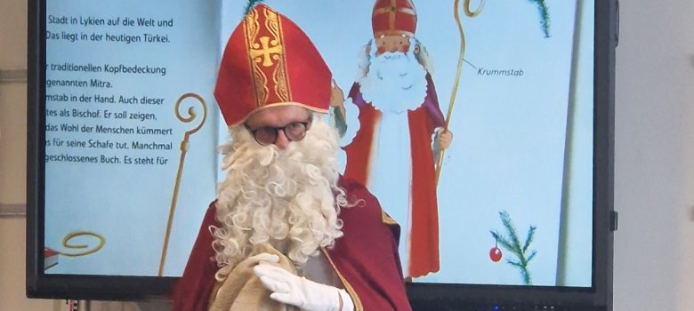 Am 5. Dezember 2025 hatten wir besonderen Besuch! Der Nikolaus kam in die ersten Klassen. Dort lobte er vor allem unsere Schulanfänger, die sich nun schon gut an den Schulalltag gewöhnt haben. Hin und wieder musste der Nikolaus natürlich auch etwas tadeln. Dennoch brachte er für alle unsere Schulkinder kleine Säckchen mit Schokolade und anderen Leckereien mit. Ein herzlicher Dank geht hierbei an seine helfenden Hände aus unserem Elternbeirat. Sie haben tatkräftig beim Packen der Säckchen mitgeholfen.
